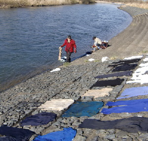 服の泥を河原で洗い流す母と姉。まるで日本昔話しです!